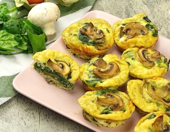 Razbijte jaja u činiju i umutite ih. Dodajte pržene pečurke, kuvani spanać, rendani sir, mleko, so, biber i dobro promešajte. Podmažite kalup za mafine i sipajte smesu. Stavite po krišku pečurke na svaki mafin. Pecite 15 minuta na 180°C.