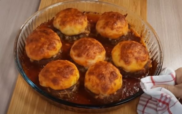 Priprema: Napravite pire krompir i ostavite ga sa strane. U posebnu činiju izmešajte mleveno meso, sitno seckan crni luk, sitno seckan beli luk, jedno jaje, sitno seckan kupus i začine. Sve izmešajte dobro. Ovu smesu podelite u 7-8 loptica koje ćete staviti uvatrostalnu činiju. Loptice malo rastanjite, kao da od njih pravite korpicu. Zapecite ih u rerni na 200 stepeni oko 20 minuta, a potom pravite loptice od pire krompira pa ga stavite u svaku mesnu korpicu. Preko nalijte malo paradajz sosa i rendani kačkavalj, pa vratite u rernu da se sve zapeče još malo.