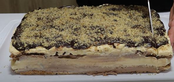 Priprema: Prvo napravite dve korice od ovih sastojaka. Belanca izmešajte sa šećerom, pa dodajte ostale sastojke lagano muteći. Smesu podelite na dva dela pa ispecite 2 korice na 180 stepeni Celzijusa. Ispečene korice presecite na dva dela, tako da dobijete 4 korice.
