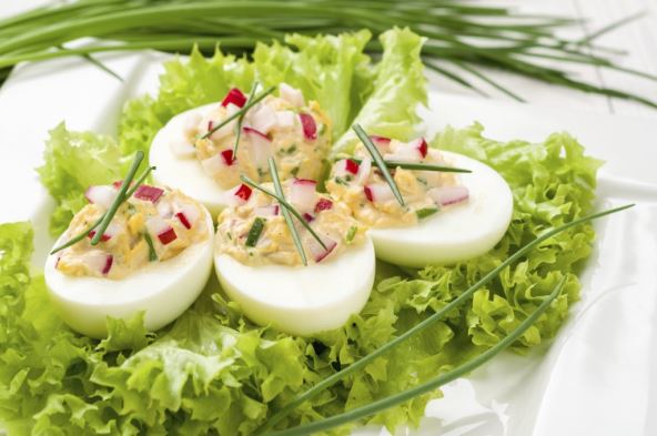 1. Za nadev sa biberom očistite 6 kuvanih jaja i prepolovite ih po dužini. Izvadite žumanca, izgnječite ih viljuškom i pomešajte sa majonezom, puterem, malo soli i konjakom. Izmrvite polovinu zrna bibera i umešajte u masu. Krem sipajte u špric sa zvezdastim otvorom, pa napunite jaja. Preostalim zrnima bibera dekorišite jaja.