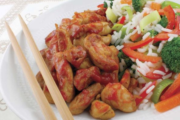 Crni i beli luk sitno iseckajte i dodajte mesu. Kada luk porumeni, nalijte usitnjen paradajz-pelat, dodajte ljutu papričicu iseckanu na kolutove, limunov sok i kukuruzno brašno, pa kuvajte 10 minuta. Piletinu servirajte uz bareni brokoli i poslužite s kukuruznim hlebom.