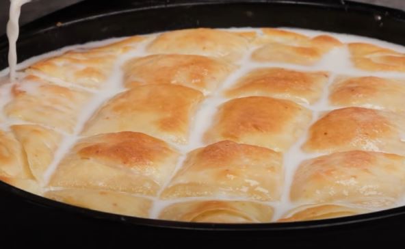 Priprema: Napravite testo od brašna, mleka, praška za pecivo i jaja. Kada umesite testo razvaljajte na 3 jufke, svaku jufku razvijte u rolat pa isecite na manje loptice. Ostavite da se testo odmori oko 10 minuta. Potom svaku lopticu razvijte što tanje i naslažite preko onih prethodnih.