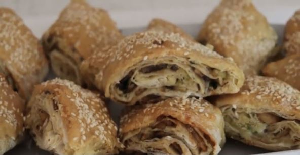 Preko prve i druge kore premazati fil od griza (po 2 kašike na svaku koru), a preko treće fil sa pečurkama. Preko četvrte i pete kore ponovo premazati fil sa grizom. Preko šeste kore sipati fil od pečuraka. Preklopiti krajeve ka unutra, pa uviti u rolat. Iseći na kocke, pa ređati na pleh. Premazati pitu preostalim filom od griza i posuti susamom, pa peći oko 40 minuta.