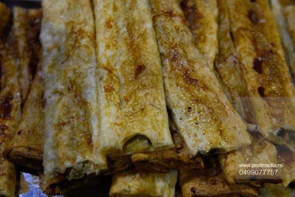 2. Manji pleh obložiti listovima kora pa ih malo namazati uljem. Prvu koru namazati uljem, pa u dnu kore dodati po širini malo mesa, saviti ivice i uviti u rolnicu. Staviti na dno uskog a dugog pleha. Tako uraditi još jednom.