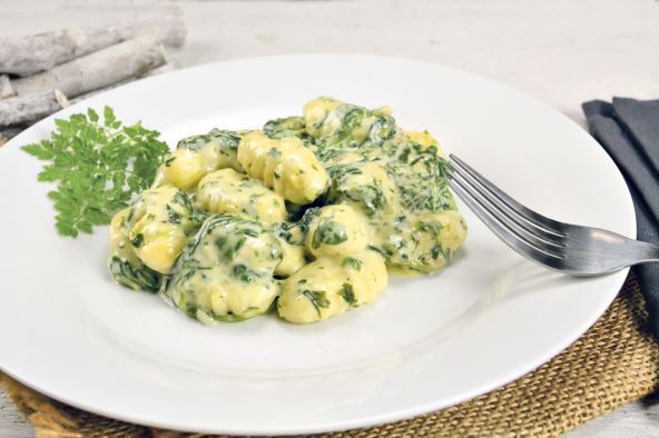 - 500 g njoka - 300 g spanaća - 3 čena belog luka - 3 dl mleka - 40 g gustina - 2 kašike ulja - bosiljak, so, biber