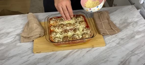 Ćufte poređati preko smese od krompira. Peći na 180 stepeni oko 30ak minuta. Dodati kačkavalj preko ćuftica pa vratiti da se dopeče još 10ak minuta.