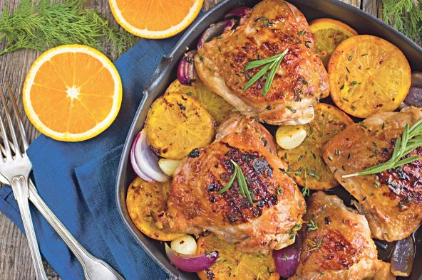 4. Batake staviti na tanjir, preliti karamelizovanim lukom i ukrasiti kriškama pomorandže i začinskim biljem.
