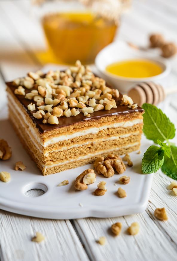 Sastojci: puna kašika masti (oko 30 g), 1 jaje, 2 dobre kašike meda, 3 kašike mleka, 150 g šećera, 450 g brašna, 500 ml mleka, 6-7 kašika griza, 200 g margarina, 150 g šećera u prahu, 100 g čokolade za kuvanje.