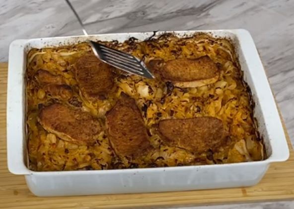 Priprema: Na ulju prepržite meso da se uhvati lepa korica. Izvadite meso i ostavite ga sa strane, pa na toj masnoći predinstajte crni luk, beli luk, i slaninicu. Kasnije dodajte sitno seckan kupus i začine. Sve izmešajte pa zatim posložite u vatrostalnu činiju i zapecite u rerni.