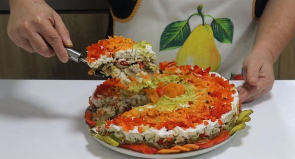 Staviti kalup na veliki tanjir i sipati polovinu smese, pa poravnjati. Premazati majonezom, pa posuti šargarepom, a zatim sipati šampinjone i praziluk. Posuti seckanim paprikama, pa sipati drugu polovinu smese. Poravnjati, pa premazati majonezom. Dekorisati po želji.