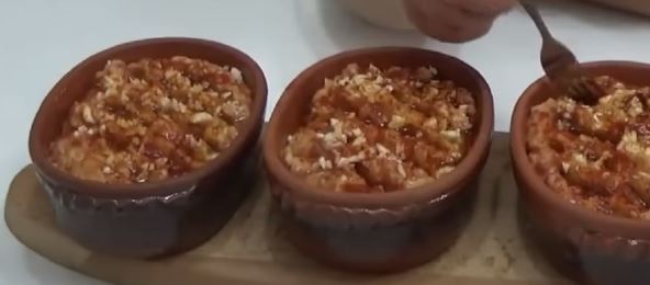 Tako začinjen pasulj stavite u vatrostalne činije, a preko njega naseckajte beli luk, dodajte suvu začinsku papriku i vrelo ulje.