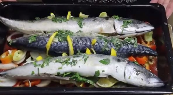 Priprema: Skušu odstajalu u marinadi dodatno napunite limunom i peršunom pa stavite preko povrća. Potrebno vam je nekoliko paprika, crni luk i paradajz sos. Pečite u zagrejanoj rerni na 200c./30-35min.