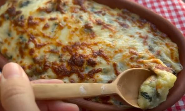 U vatrostalne činije prvo stavite sloj krompir pirea, pa preko dodajte sloj od mesa i pečuraka i spanaća, a onda preko svega toga obilno nalijte bešamel sos i malo kačkavalja.