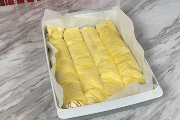 Svaku koru premažite sa mešavinom jaja i griza, a potom filom od sira pa umotajte i stavite u tepsiju. Kada potrošite sve kore i materijal, premažite pitu sa smesom od jaja i griza. Pecite u rerni na 200 stepeni Celzijusa oko 45 minuta.