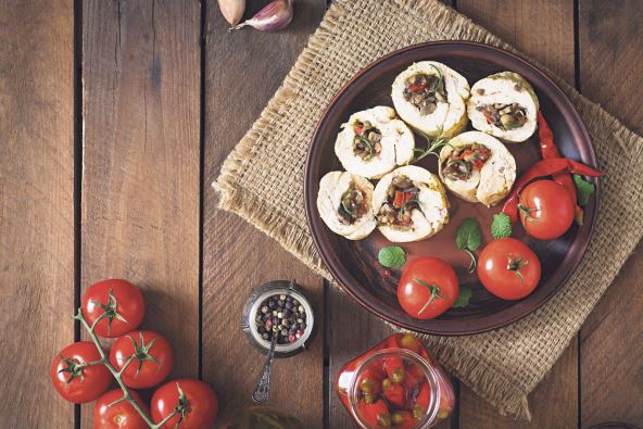 1. Pileći file izlupati tučkom za meso i na njega slagati mocarelu, rukolu, seckane orahe, baburu i na listiće iseckane šampinjone. Posoliti i pobiberiti, smotati u rolnicu, zatvoriti čačkalicom i peći u podmazanoj tepsiji 20 minuta na 200 stepeni.