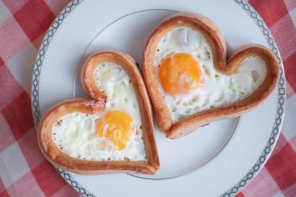 Kalup u obliku srca utisnite u sredinu hleba i izvadite taj deo. Ostatak parčeta stavite na podmazan pleh pa u sredinu stavite jaje, posolite i ispecite. Servirajte na tanjiru na kom ste kečapom iscrtali srca.