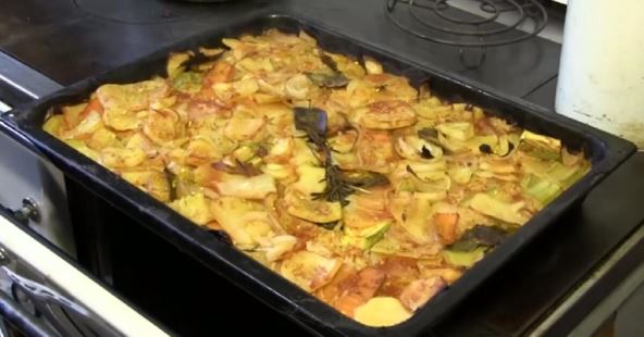 Oljuštite tikvice i isecite ih na kriške. Nakon toga prodinstajte svaku od njih nekoliko minuta u maslinovom ulju. U drugoj posudi prodinstajte luk iseckan na sitno, patlidžan, paprike i krompir. Dodajte začine i sklonite s ringle.