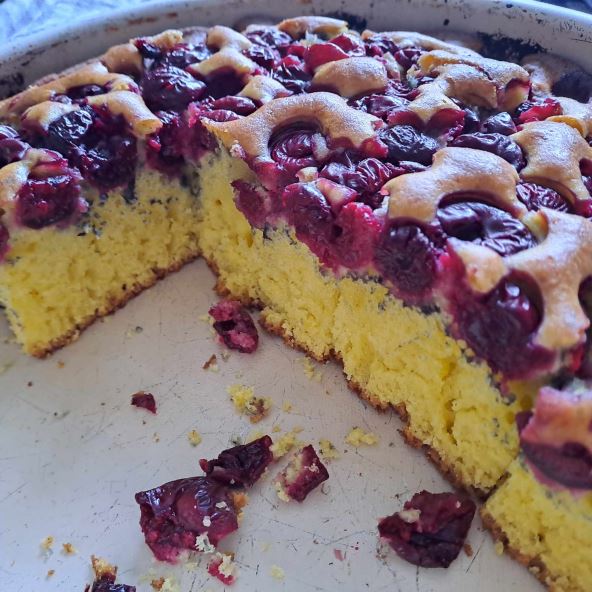 Priprema: Umutiti sve sastojke zajedno, osim višanja. Sve preručite u podmašćen pleh, a preko stavite višnje. Ispecite u rerni na 200 stepeni, oko 15 min, isključite rernu pa ostavite kolač još malo.