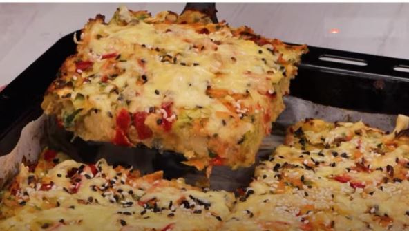 Potom umutiti jaja, dodati mleko, maslinovo ulje, so, biber, sve dobro sjediniti pa zatim dodati brašno i prašak za pecivo. Smesu dodati u činiju sa povrćem. Dobro izmešati sve sastojke pa sipati u pleh obložen pek papirom. Ravnomerno je rasporediti i peći 20 minuta u rerni zagrejanoj na 180 stepeni.