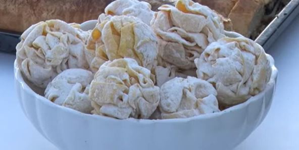 Brašno i jaja sjedinite, pa umesite testo (kao za domaće rezance za supu). Na pobrašnjenoj površini razvaljajte testo da bude tanko i isecite trake širine palca.