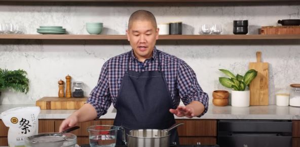 U ovoj demonstraciji, na dve čaše suvog pirinča dodaje dve čaše i jednu četvrtinu čaše vode. Ovde je bitno napomenuti da je njegova metoda usmerena na zadržavanje skroba u pirinču, a ne u vodi, te je zato izuzetno važno ne mešati pirinač jednom kada je voda dodana.