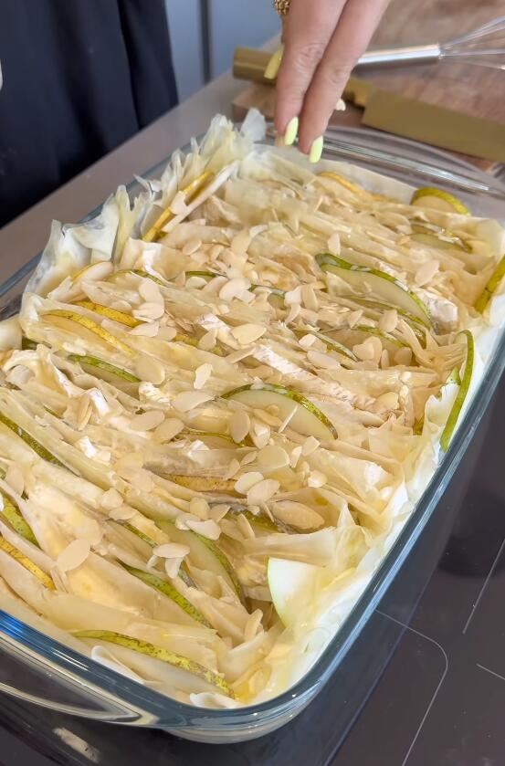 Pleh ili vatrostalnu činiju, u zavisnosti od toga gde ćete peći vašu pitu, najpre premažite puterom. Onda poređajte kore u "harmonika" stilu, jednu do druge, dok ne popunite ceo pleh. Sada isecite bri sir na dugačke i tanke trake pa ga ugurajte između napora na korama, sa kruškama uradite isto to kada ih isečete na isti način. Nakon toga umutite 2 jaja sa dve kašike grčkog jogurta i malo mleka, pa prelijte preko pite.