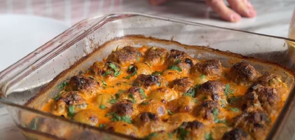 U vatrostalnu činiju posložite ćuftice i mlade krompiriće koje ste kratko obarili. Zatim sve stavite u rernu da se peče na oko 20 minuta, na temperaturi oko 200 stepeni Celzijusa.