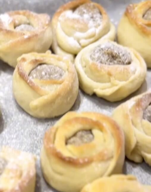 Zatim testo uzimamo po malo i rastanjujemo oklagijom, kada dobijemo tanku kružnicu zasečemo je na sve 4 strane, u sredinu stavimo kuglicu fila i uvijemo je testom u obliku ružice.
