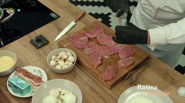 Sve što je potrebno: Svinjski file glavica crnog luka Šampinjoni čen belog luka Slanina Prstohvat peršuna Palenta Kockica putera Brašno