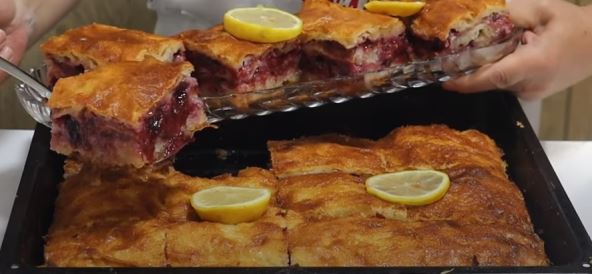 Zatim umutite fil od jaja, šećera, kiselog mleka, ulja, griza, vanil šećera, praška za pecivo i griza. U veći pleh složite jednu koru pa je premažite dobijenim filom kao za palačinke. Zatim drugu koru premažite, pa treću, pa stavite fil od šljiva. Tako ređajte do kraja. Završite filom od jaja. Ispecite u rerni na 200 stepeni Celzijusa. Zatim ohlađenu pitu prelijte sa ohlađenim prelivom od vode, šećera i limuna.