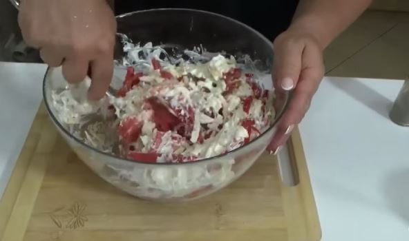 Izrezati paprike na štapiće i staviti ih u činiju, pa isei paradajz na četvrtine (kašikom izvući sredinu paradajza pa ga izrezati na štapiće i pomešati sa paprikama. Propržiti beli luk i dodati surimi štapiće pa propržiti dva minuta. Izvatiti štapiće na tanjir i ostaviti da se hladi, a uljem i belim lukom preliti paradajz i paprike, dodati i štapiće i rendani sir. Dodati malo limunoog soka, majonez, pavlaku i začine pa sve lepo promešati.
