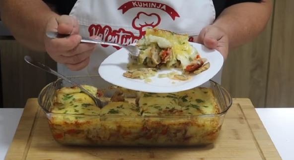 Izrezati krompir i staviti da se kuva oko 10, 15 minuta i posoliti. Za fil: Propržiti luk, pa dodati sitno seckane paprike i pržiti. Dodati listiće šampinjona, pa sve zajedno dinstati. Dodati iseckanu slaninu i kobasicu iseckanu na kolutove, pa začiniti. Pržiti oko 10 ak minuta. Kuvanom krompiru dodati rendani sir, peršun, začine i mleko pa napraviti pire. Podmazati vatrostalnu posudu i sipati polovinu pirea, da se prekrije dno. Izručiti sav fil preko pirea i ravnomerno rasporediti. Prekriti ostatkom smesne pirea, pa dodati oko 150 g rendanog sira. Peći na 200 stepeni, oko 20 minuta.