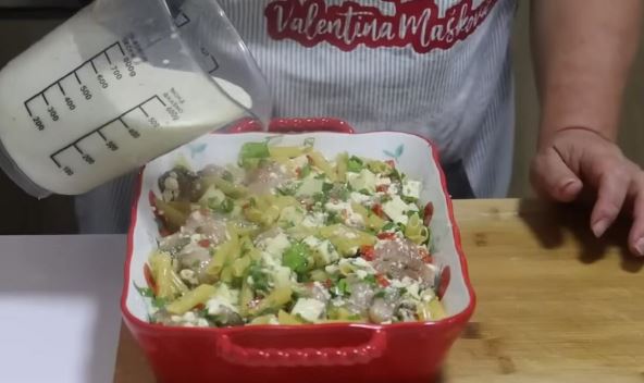 Sipati u vatrostalnu posudu makaronzdae, iseckane paprike, peršun i sir i izmrvljeni sir. Umutiti jaja, pa preliti i dodati iseckano meso. Dodati začine. U mleku razmutiti supu od pečuraka i prašak za pecivo. Promešati sve namirnice u vatrostalnoj posudi, pa preliti prelivom od supe i mleka i sipati ostatak čistok mleka. Peći na 200 stepeni oko 30 minuta.