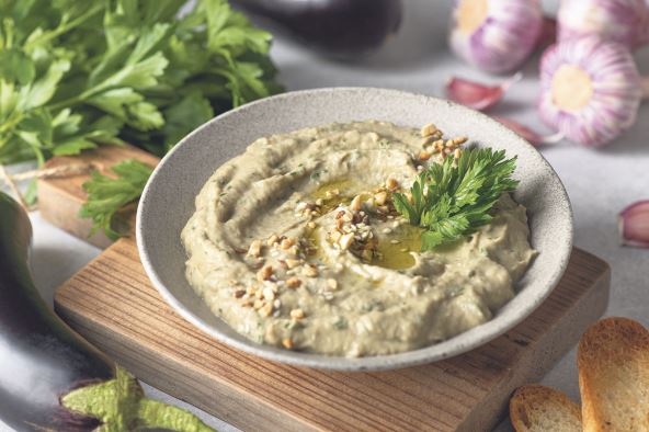 2. Pečeni patlidžan ostavite da se prohladi, pa mu oljuštite ljusku. Stavite ga u blender ili izmiksajte štapnim mikserom. Dodajte sir, maslinovo ulje, sok od limuna i zgnječen beli luk. Dodajte soli i bibera po ukusu i na kraju sitno iseckan peršun.