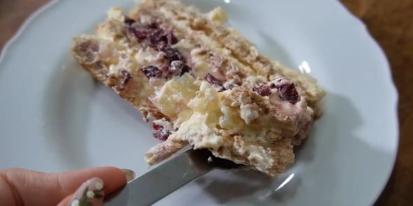 Slaganje torte: Prva kora se namaže kremom, pa se preko njega stavi ananas, pospe sa delom iseckanog badema i malo krema. Na to se stavi druga kora, pa krem, iseckane višnje i opet malo krema. Treća kora se namaže filom i pospe mlevenim bademom i preko nje četvrta kora, opet fil odgore i puno listića badema. Kada torta odstoji preko noći u frižideru, da se stegne i sjedini, odseku se krajevi da bi se sa strane videli lepo svi slojevi torte.
