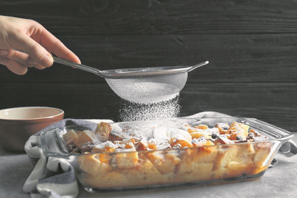 3. U posudi umutite jaja, te dodajte mleko, šećer, cimet i vanilu. Smesu prelijte preko hleba i lagano sve potisnite viljuškom da je hleb upije.