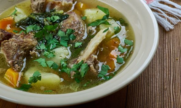 U dublju šerpu stavite crni luk da se dinsta. Dodajte sitno seckanu junetinu i začine i sve dinstajte. Dodajte šargarepu i nalijte paradajz sok. Dodajte na rezance seckan raštan, ali i suvo meso ili rebra pa sve kuvajte dok ne omekša.