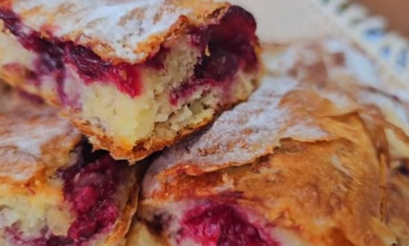Drugi red isto tako ali preko pobacati višnje. Preko višanja opet tri zgužvane kore premazane jajima i grizem pa višnje i tako do kraja.
