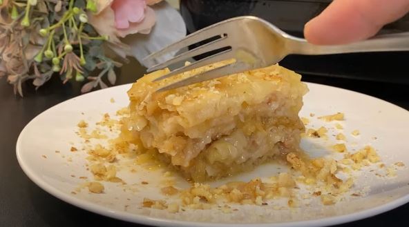 Priprema: Jabuke izrendajte, dodajte im šećer i cimet. Pleh obilno namažite maslacem, stavite koru, pa na nju fil od jabuka i preko punu šaku oraha. Zatim to ponovite dok ne potrošite sav materijal. Isecite pitu na kocke, i kada se ispeče prelijte je sa ohlađenim šerbetom od šećera, vode i limuna.