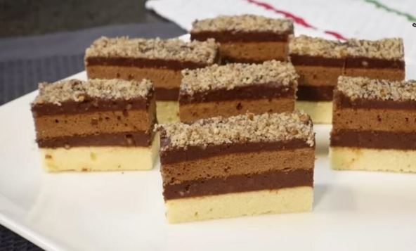 Dok se kore peku možete da pripremite fil. Puter, šećer i čokoladu stavite u šerpu, pa zagrevajte na umerenoj vatri dok se potpuno ne rastopi. Vodite računa da često mešate da vam ne zagori. U rastopljenu smesu dodajte mlevene orahe i sve lepo sjedinite. Na tacnu prvo stavite svetlu koru, zatim je premažite jednom polovinom fila. Preko stavite tamnu koru i premažite je ostatkom fila. Kolač po želji pospite mlevenim orasima. Kada se prohladi secite ga na kocke i služite.