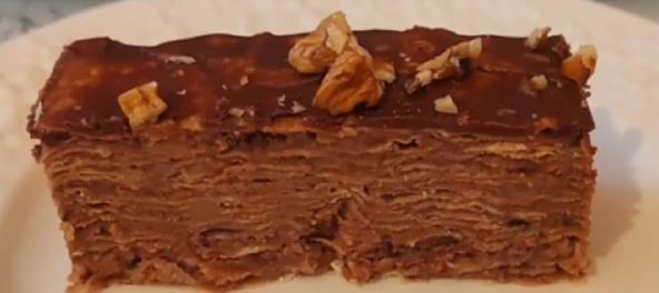 U vruć krem dodati 300 g čokolade za kuvanje i mesati da se lepo rastopi. Ostaviti da se skroz ohladi uz povremeno mešanje. mU ohladjen krem dodati 500 g mlevenih oraha, 4 vanilin šećera i rendanu koru jednog limuna.Filovati korice tanko, pa redjati jednu preko druge blago pritiskajući da se spoje. Preliti glazurom koju treba otopiti na pari.