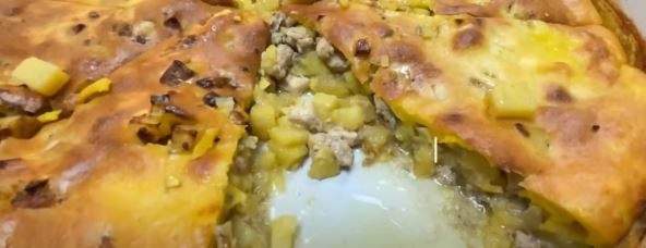 Umutite jaja, mleko, vodu, brašno i začine i prelijte preko krompira nakon 20 minuta pa sve još dopecite.
