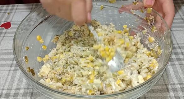 Skuvati makarone. Iseckati šampinjone na listiće i propržiti na ulju i posoliti. Pobiberiti. Iseckati kisele krastavce na kockice, iskeckati kačkavalj. Makarone prebaciti u velilku činiju, dodati šampinjone, obareni kukuruz, prpečeni susam, krastavčiće i kačkavalj. Sve dobro promešati i sjediniti, pa dodati majonez i promešati. Prijatno!