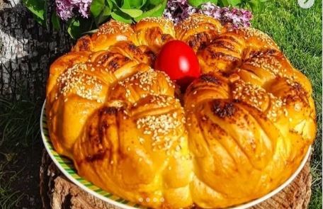 Tako pripremljenu smesu ubaciti u središnji deo posude. Pogaču ostaviti 30 minuta da nadođe, premazati je žumancetom, posuti susamom i peći 30 minuta u zagrejanoj rerni na 200 stepeni.