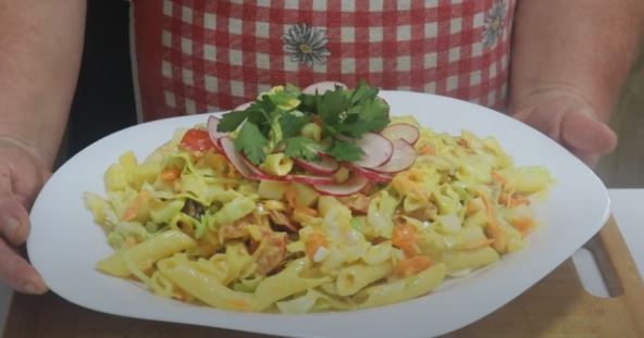 - Priprema: Povrće po volji iseckajte što sitnije, dodajte kuvane makarone, suhomesnato i kuvana jaja, pa sve prelijte sa dresingom od umućenih jaja, vode, soli, senfa, sirćeta i ulja. Ovu salatu možete da ponesete i na posao, držaće vas sitim čitav dan.