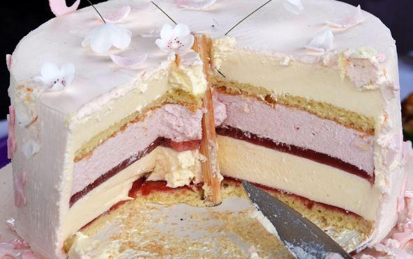 Premažite vanila krem, pa voćni žele. Stavite drugu koru. Namažite roze mousse. Premažite celu tortu belim kremom. Ukrasite jestivim cvetovima ili listićima badema. Ostavite da se torta hladi minimum 4–6 sati, idealno preko noći.
