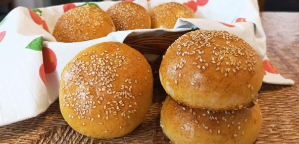 Odgovarajući pleh prekriti pek papirom i ostaviti ga na stranu. Naraslo testo prebaciti na pobrašnjenu podlogu, izdužiti ga rukama u valjkasti oblik i podeliti na šest jednakih delova. Od svakog dela oblikovati lopticu. Loptice testa poređati u pripremljeni pleh, koji se prekrije kuhinjskom krpom i ostaviti 30 minuta da lepinje narastu. Narasle lepinje premazati mešavinom žumanceta i mleka, pa ih obilno posuti sa susamom. Ponovo ih premazati sa mešavinom žumanceta i mleka, tako vam se susam neće "razleteti" na sve strane kada ih jedete. Staviti lepinje da se peku, u prethodno zagrejanu rernu, na 180 stepeni oko 25 minuta sve dok ne dobiju lepu rumenu boju. Pečene lepinje prekriti kuhinjskom krpom i ostaviti ih u plehu dok se malo ne prohlade, pa ih poslužite.