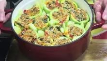 Priprema: Tikvice izdubite pa ih poređajte u dublju šerpu. Između tikvica dodajte krompir, a preko prelijte paradajz sos. Tikvice naputine filom od sitno seckanog luka, rendane šargarepe, mlevenog mesa, začina i sredine od tikvica. Preko napunjenih tikvica kašikom prelijte još malo vode i isecite paradajz. Kuvati na umerenoj temperaturi ili zapeći u rerni.