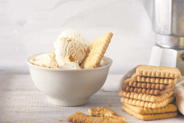 2. Keks izmrvite (nemojte ga sasvim usitniti jer su upravo komadići keksa ono najzanimljivije u ovom sladoledu) i dodajte ga u smesu. Zatim, mešajući kašikom, dobijenu masu pomešajte sa umućenom slatkom pavlakom u kompaktnu masu.