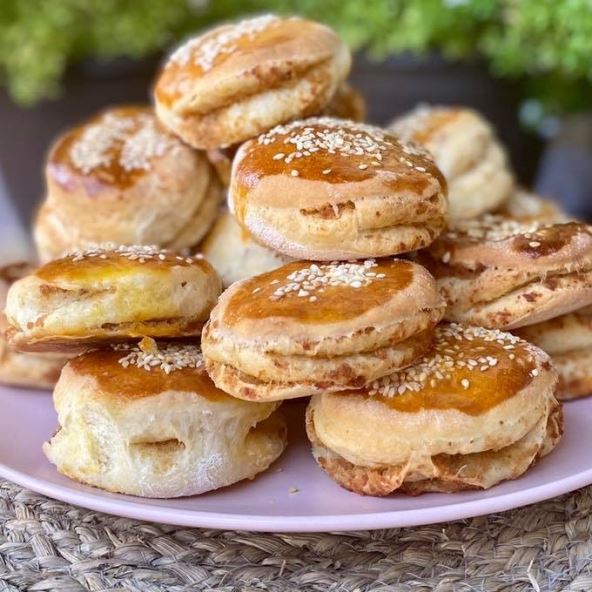 3. Uključiti rernu na 200°C. Testo razvaljati na oko 2 cm debljine i okruglom modlom vaditi pogačice prečnika oko 5 cm. Žumance razmutiti sa mlekom, pa četkicom premazati površinu svake pogačice.